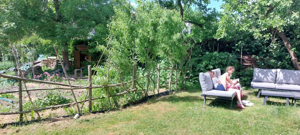 Bij Ons Dorpje Overeind werden we ontvangen door initiatiefnemer Loes. Die met een baby op schoot zat, omdat de mama bezig was met een rondleiding geven aan een groep bezoekers. Of we zelfgemaakte vlierbloesemcake en vlierbloesemlimonade lusten? Dat laten we ons geen tweede keer zeggen! Nadat we net een hap hadden genomen zagen we iemand voorbij komen lopen die bezig was met de rondleiding. Milou & Naomi namen met een Donald Duck en plak cake plaats op de stoelen. Natasja & Ralph konden zo aanhaken bij de rondleiding om de tuin en gemeenschappelijke ruimte te bewonderen.