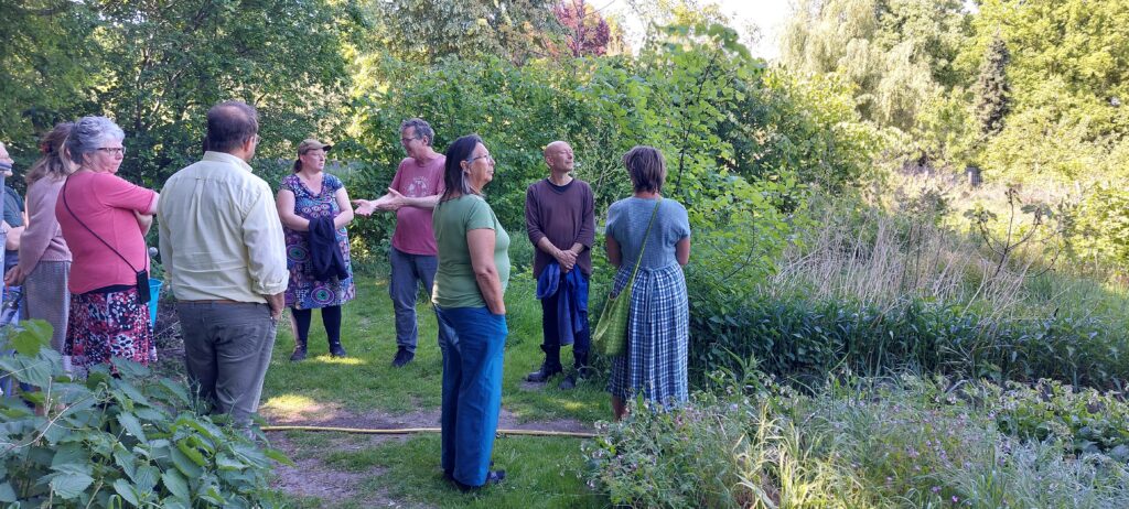 Na de training en een heerlijke lunch liepen we vanaf de trainingslocatie naar Ecodorp Boekel. Als er één ecodorp is dat bekend is in Nederland dan is het wel Ecodorp Boekel. En de initiatiefnemer Ad gaf de rondleiding zelf. Met veel enthousiasme leidt hij op wekelijkse basis verschillende groepen rond in het ecodorp. We kregen uitleg over de verschillende materialen die zijn gebruikt, achtergrond van de moestuin/voedselbos en natuurlijk een rondleiding waarbij we zelf een kijkje mochten nemen in het beroemde dorp.